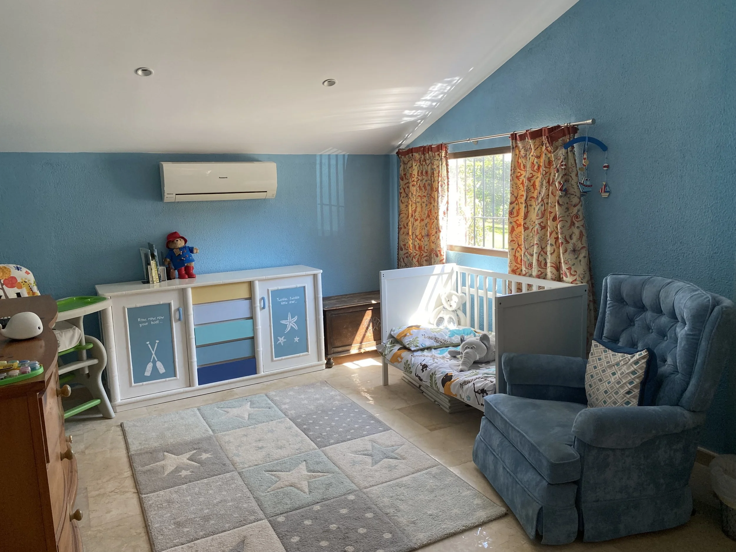 The spacious family bedroom provides the perfect blend of comfort and practicality for parents and children alike. Centred around a generous king-size bed with a warm pine furniture finish, the room is thoughtfully designed to accommodate the whole family. A dedicated toddler/child cot and a separate play area make it ideal for younger guests, while a television and independent air conditioning ensure everyone can relax in comfort. an additional single bed can be provided for older children.
