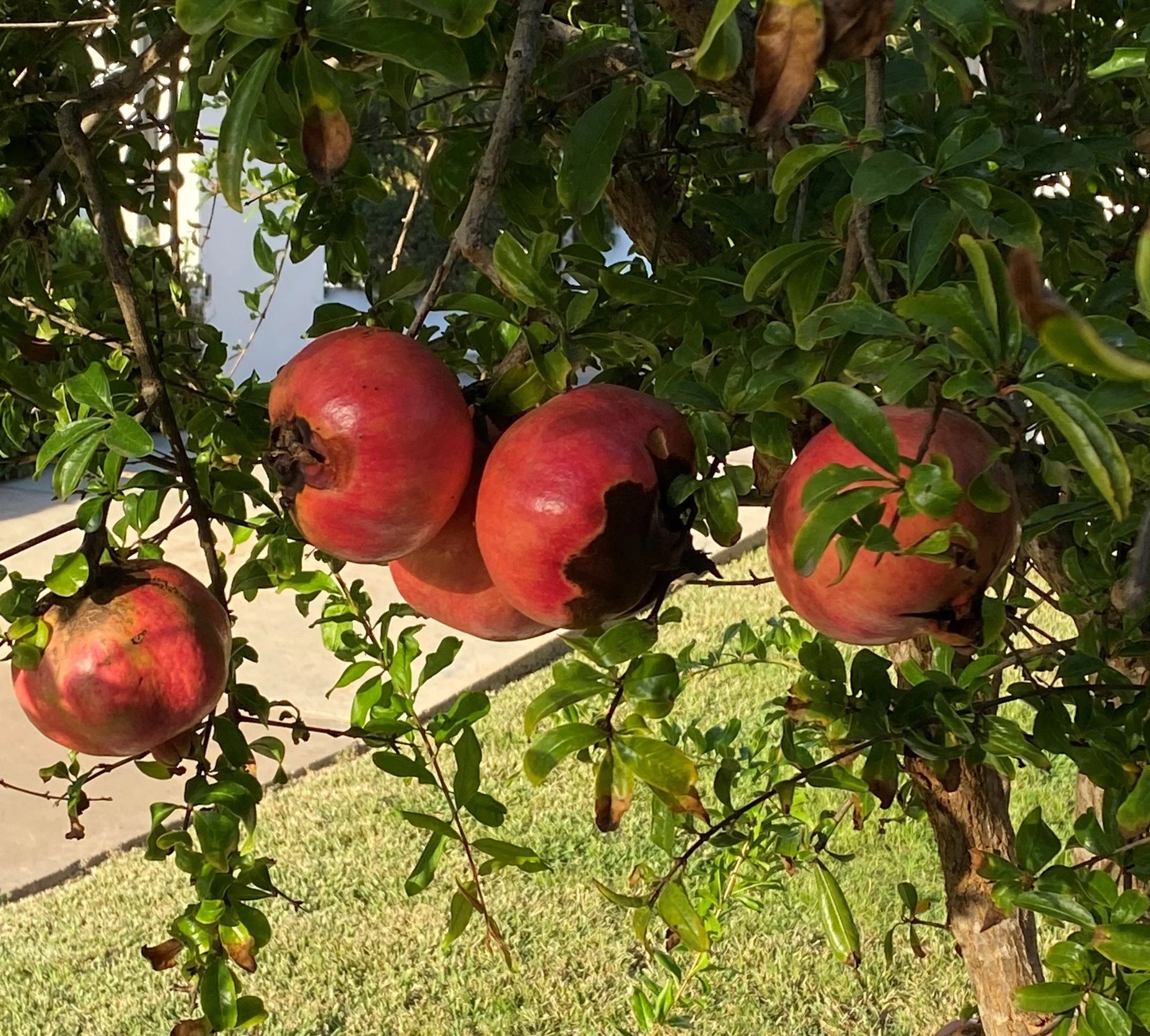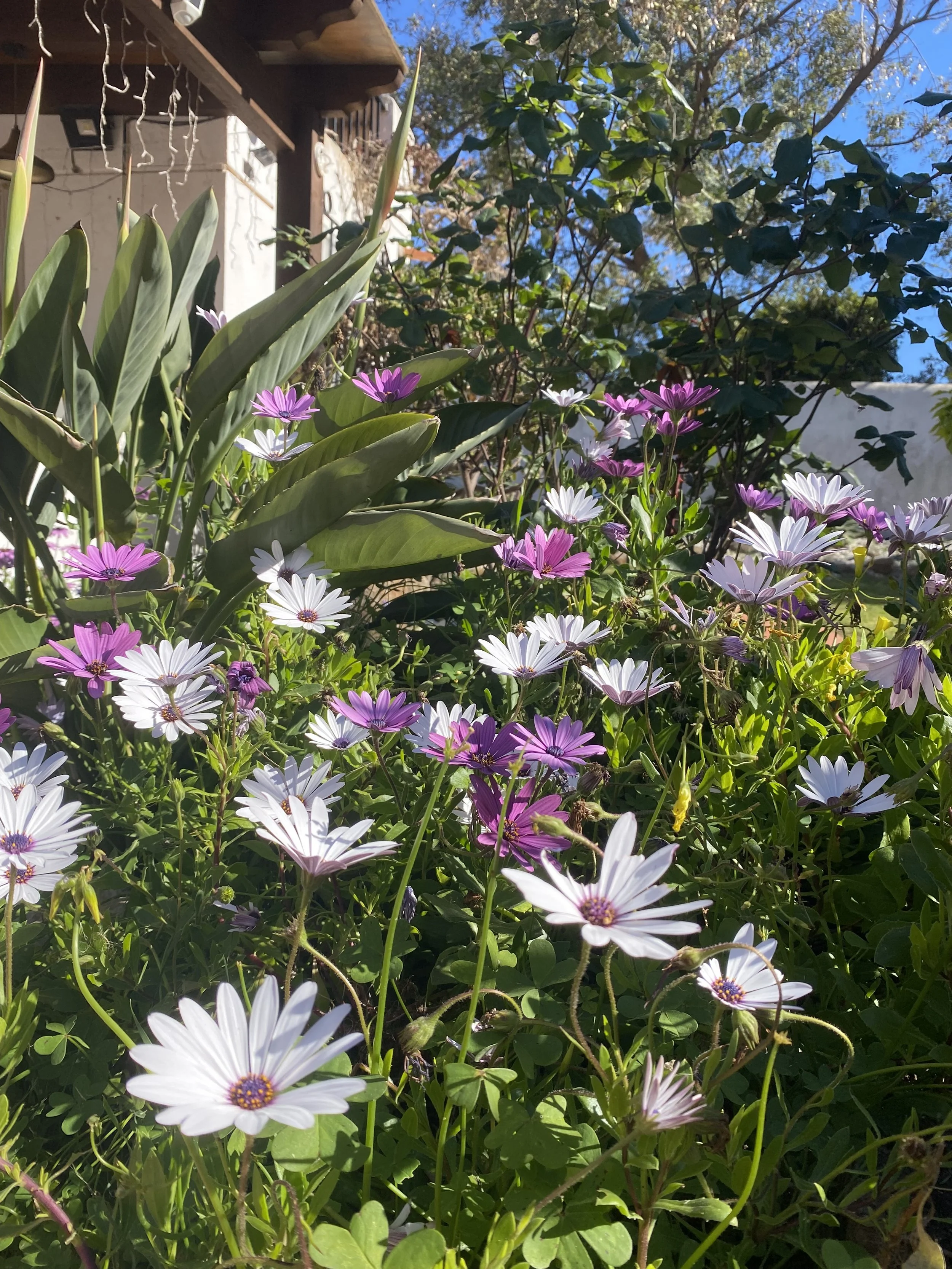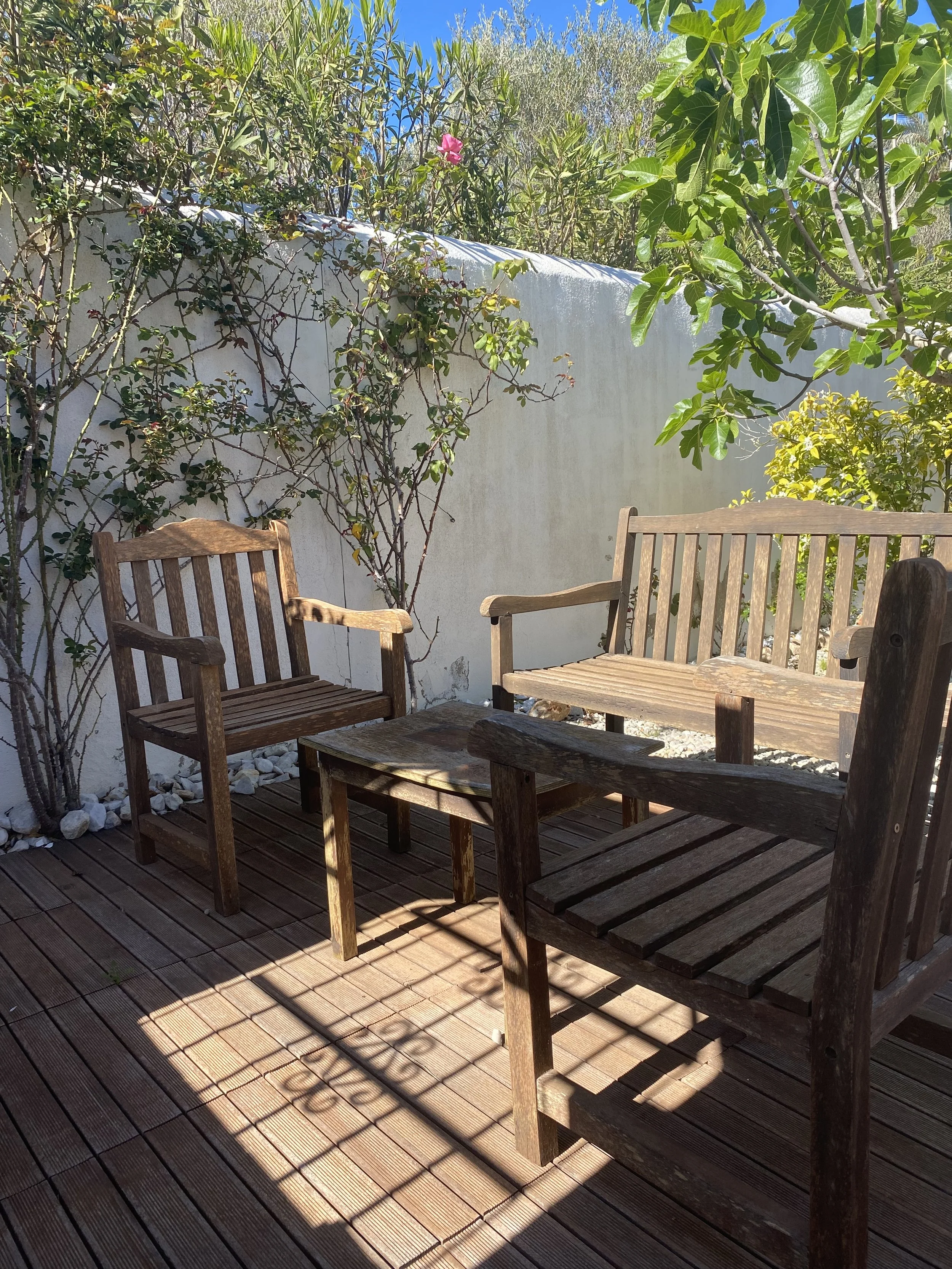 The gardens are rich with character, featuring an impressive collection of mature fruit trees — including pomegranate, plum, apple, fig, olive, lemon, orange, and kumquat — alongside vibrant rose bushes, colourful begonias and bougainvillea.