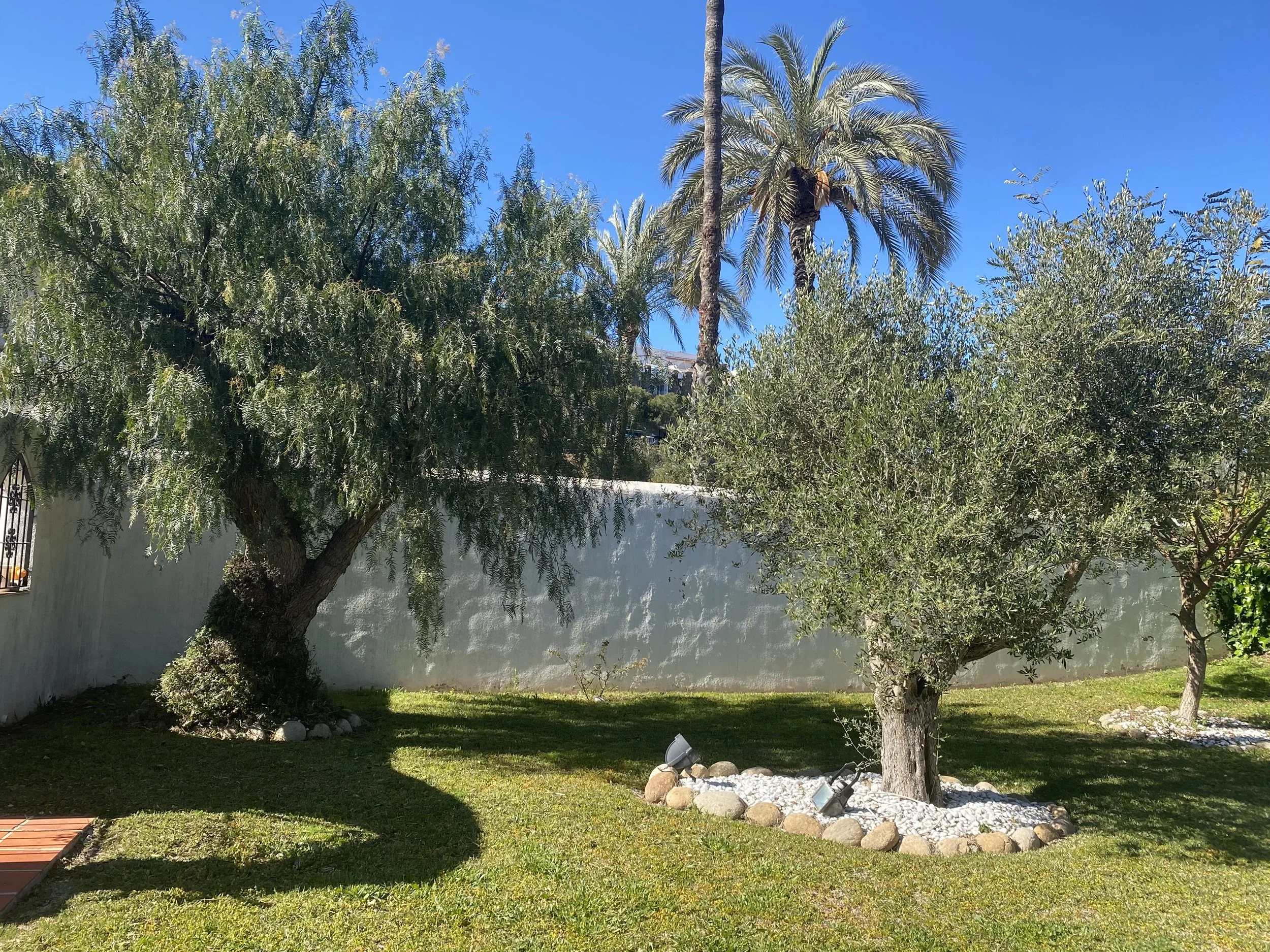 The gardens are rich with character, featuring an impressive collection of mature fruit trees — including pomegranate, plum, apple, fig, olive, lemon, orange, and kumquat — alongside vibrant rose bushes, colourful begonias and bougainvillea. Tall palm trees sway gently overhead, complemented by charming rock gardens and patios that add texture and elegance to this lush, Mediterranean paradise.
